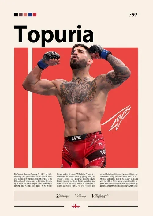ILIA TOPURIA IS A GEORGIAN AND SPANISH PROFESSIONAL MIXED MARTIAL ARTIST. HE CURRENTLY COMPETES IN THE FEATHERWEIGHT DIVISION IN THE ULTIMATE FIGHTING CHAMPIONSHIP, WHERE HE IS THE CURRENT UFC FEATHERWEIGHT CHAMPION.